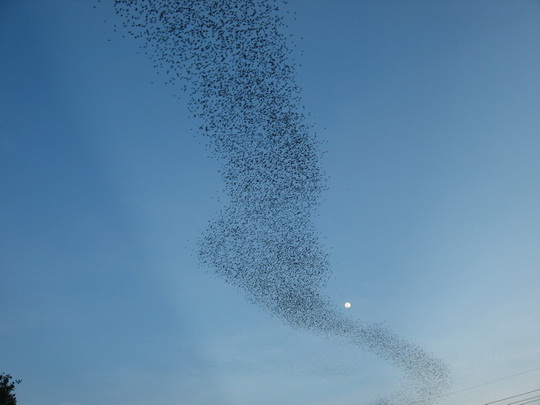 של מיליוני עטלפים עפים יחדיו החוצה מהמערה.